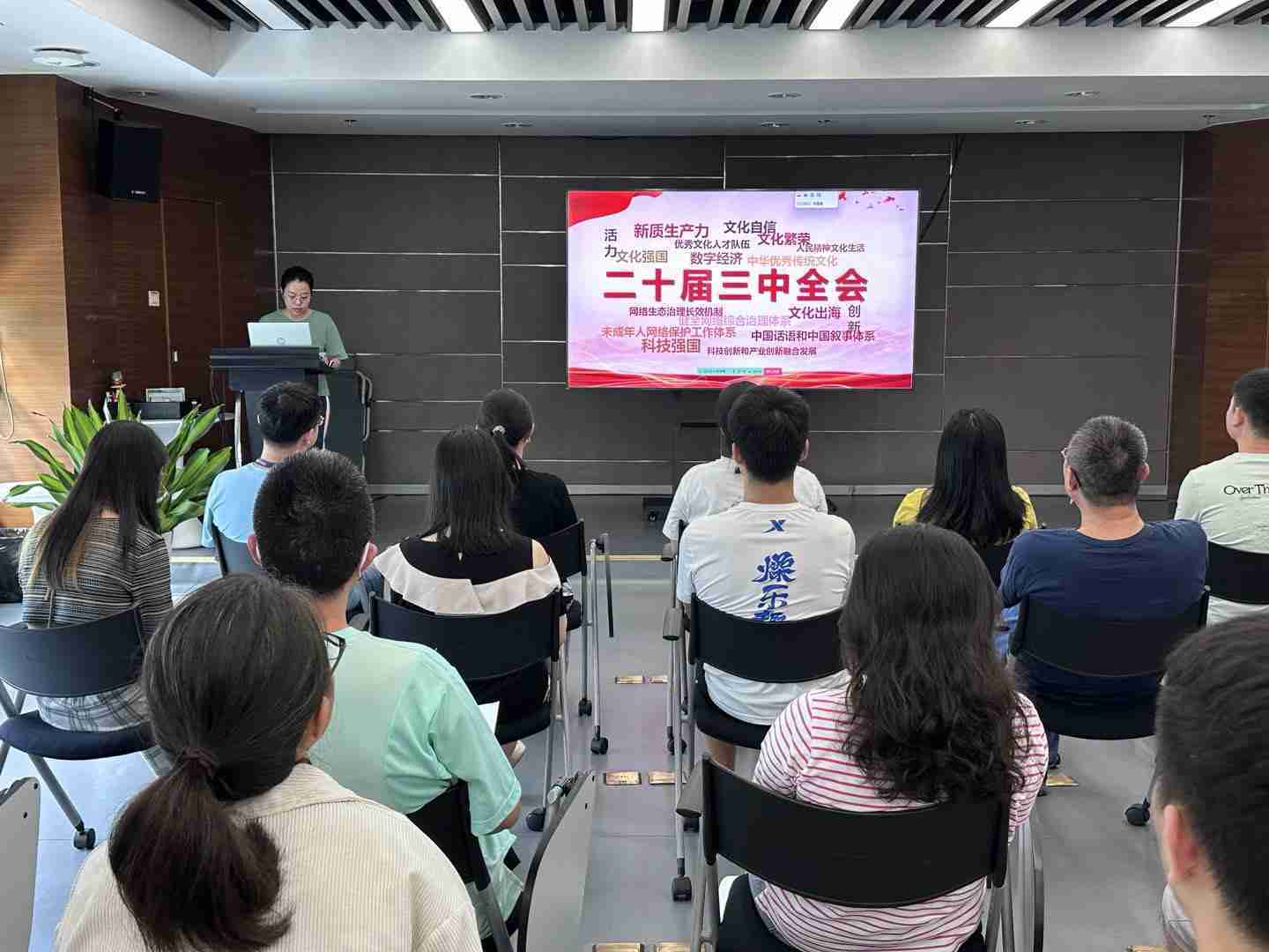 与会人员深入学习《决定》内容。。党的二十届三中全会提出必须增强文化自信,,,发展社会主义先进文化,,弘扬革命文化,,,传承中华优秀传统文化,,,加快适应信息技术迅猛发展新形势,,,构建更有效力的国际传播体系,,这为广大文化产业工作者指明了奋斗方向。。。