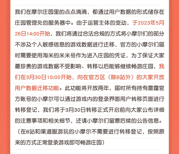 合作结束本就是开发方和代理方双方的事情,,,降低这件事情对玩家的影响,,,,才是对所有珍视这段童年的摩尔玩家最好的呵护。。目前看来,,,,用户完全不用担心后续因无法登录游戏而造成任何数据上的损失,,只要及时进行账号转移,,就可以好好保留、、、、延续在庄园的痕迹和回忆,,,,继续在庄园里做快乐的红鼻子小鼹鼠。。。