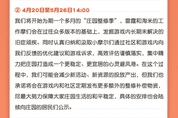 合作的结束并不意味着这个童年IP的结束,,,,对于《摩尔庄园》手游而言,,这是一个新阶段的开始。。后续游戏内将开启庄园重构计划,,,会就以往遗留下来的BUG进行集中修复,,,并在游戏内和社区定期发布更多补偿物资。。