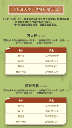 除了“油王”争霸赛,,,,精英主播招募活动亦同步开启!!!赛事分时长奖和人气奖,,,,奖励同样丰厚!!!