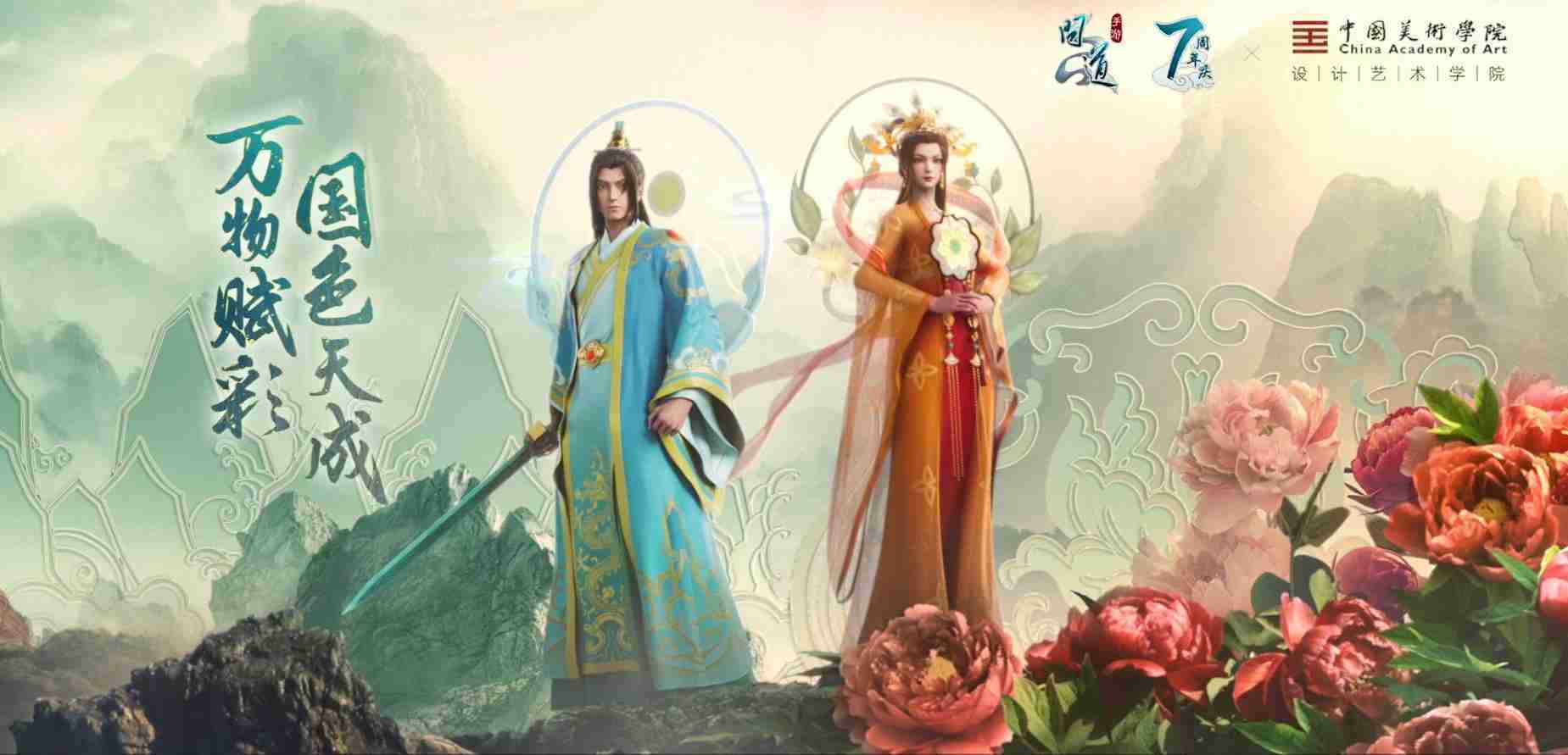 2023年4月,,,《问道手游》联动中国美术学院,,,在游戏中融合了中国历史上不同时期的文化元素,,打造了“山河万象”与“凤鸣九霄”的国风时装。。。。在色彩配置方面,,创作团队基于对游戏角色特性的分析提取相应的文化内涵,,从每一种色彩的色相、、、指代事物和情感出发对应角色属性,,,,选定服装的色彩搭配。。。。在纹样设计方面,,,创作团队结合游戏角色自身特殊的造型比例和形态,,,在实际的纹样设计中进行了游戏语境下的活化演绎。。。男性角色集中使用了如蟒纹、、、海水江崖纹、、、如意纹和云气纹等传统纹样元素,,,女性角色则吸纳了凤凰纹、、牡丹纹、、、、卷草缠枝纹等元素,,,,组成以“双凤牡丹纹样”“缠枝牡丹纹”“金玉凤冠头饰”为主要纹样的游戏角色装饰图案系统。。。。